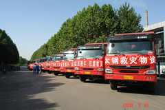 2008年5月30日,我公司選派3公司10臺豪沃8X4自卸車,承擔了太鋼支援甘肅地震災區(qū)700頂帳篷等物資的緊急運送任務。