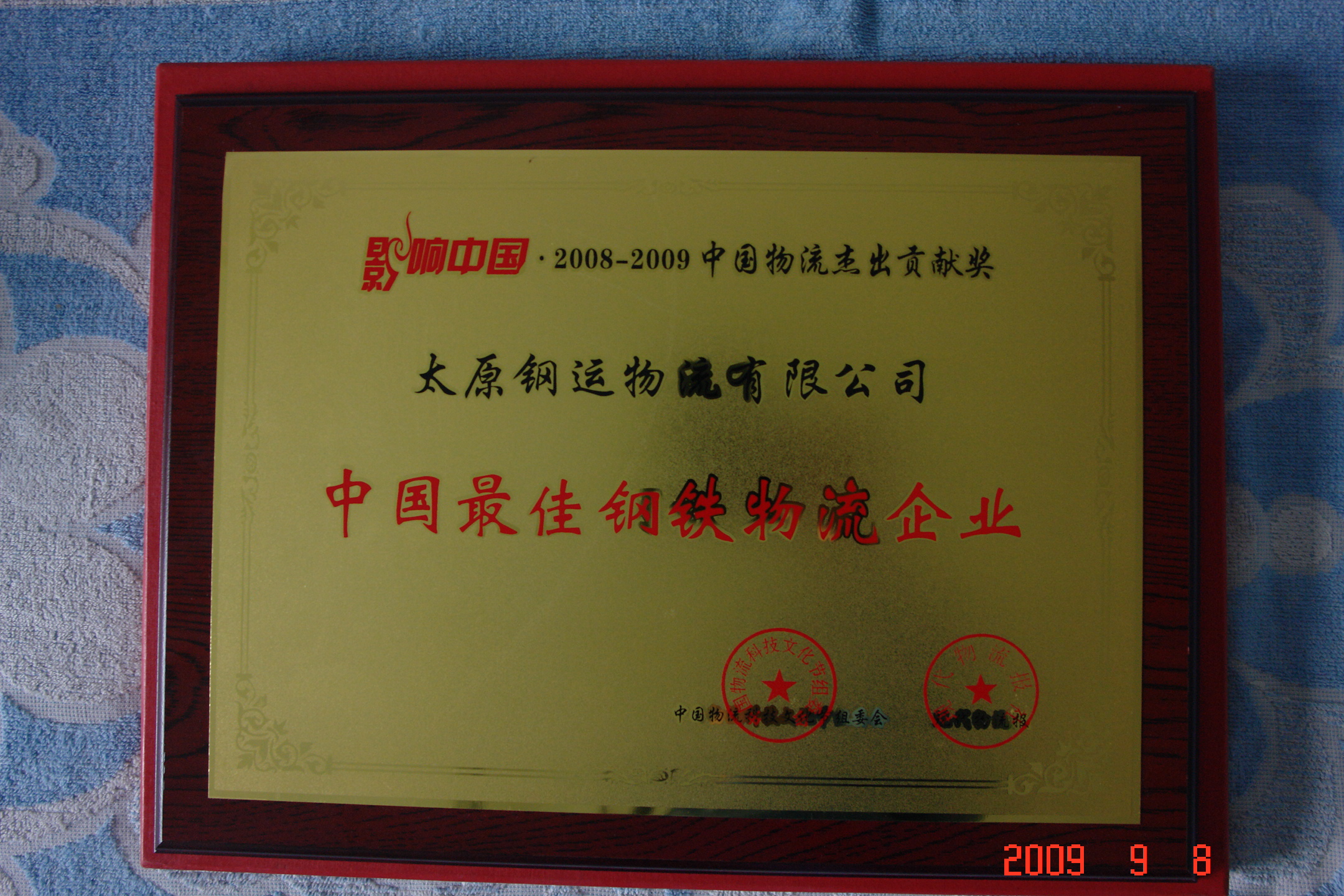 2009年9月3日,我公司在"第三屆中國(蘇州)國際物流與供應(yīng)鏈合作發(fā)展高峰論壇"暨"影響中國2008--2009中國物流杰出貢獻獎"表彰活動中,被授予"中國**佳鋼鐵物流企業(yè)"榮譽稱號。