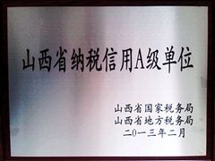 2013年6月14日,我公司榮獲省國稅、地稅聯(lián)合頒發(fā)的“山西省納稅信用A級(jí)單位”榮譽(yù)稱號(hào)。