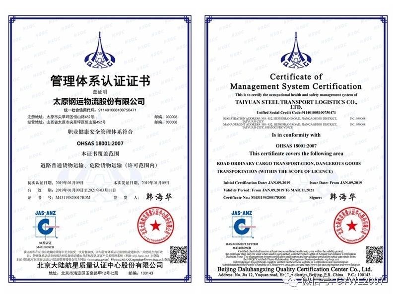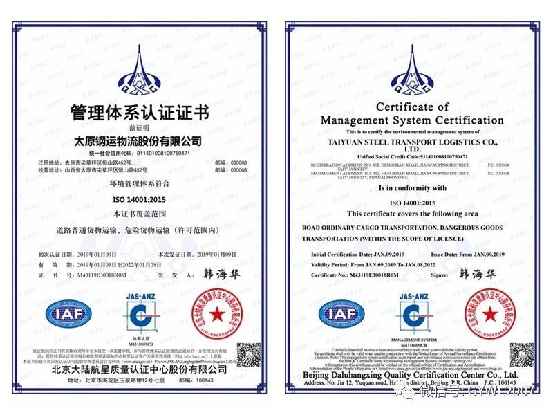 2019年1月,公司通過ISO9001質(zhì)量管理體系、ISO14001環(huán)境管理體系、ISO18001職業(yè)健康安全管理體系認證。ISO三標一體認證的通過,標志著公司始終踐行推進冶金物流服務(wù)本質(zhì),持續(xù)強化以用戶為中心的服務(wù)理念;充分反映公司全力打造綠色****物流企業(yè)發(fā)展規(guī)劃的堅定決心,同時通過提高職業(yè)健康安全管理水平、優(yōu)化管理流程、完善管理體系、規(guī)范作業(yè)標準等手段提升公司競爭力,為公司開拓市場、永續(xù)發(fā)展提供了有力保障。